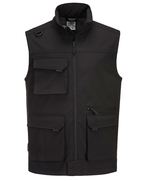 Colete laboral multibolsos com gola em bico e fecho central em puxador no ziper.