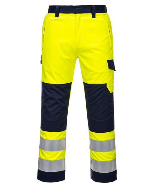 Colete reversivel multibolsos e de alta visibilidade, com gola alta e fecho central com ziper reversivel.